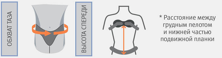 Размер подбирается по окружности таза и по высоте. Высота - это расстояние между подушечкой, расположенной на грудине, и ремнем на тазе.